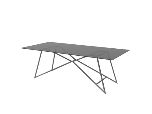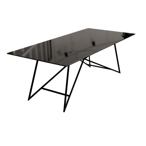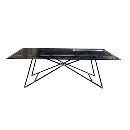 Questo tavolo asso è molto elegante, il top è in vetro fumè e la base in metallo verniciato di nero.