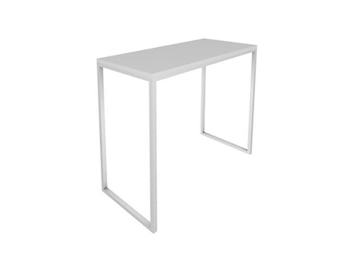 Table with melamine top and rectangular section painted metal legs.