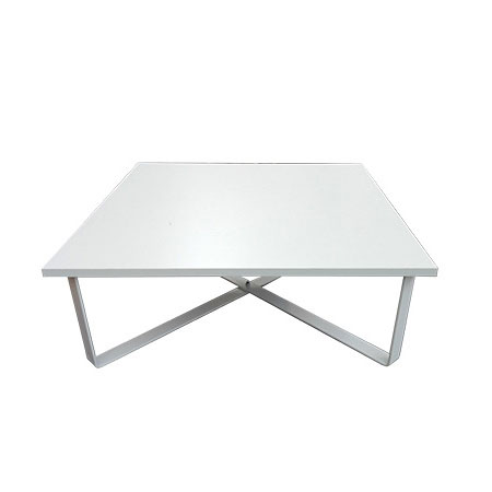 Low square table with painted laminate top. The supporting structure is a cross-section tubular with a square section.